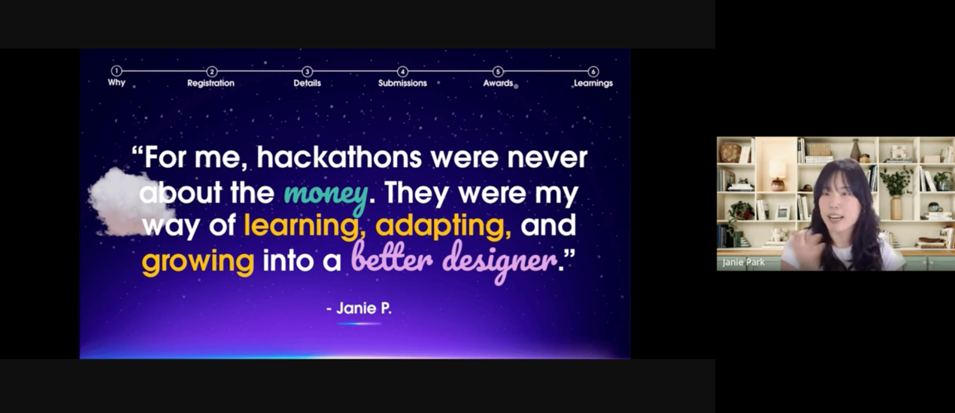 She showcased her exceptional ability to visualize the solution from the user's perspective and describe the value in terms of accuracy and time saved. Janie's presentations were of top quality. Thanks to her efforts, the team won third prize in the competition."