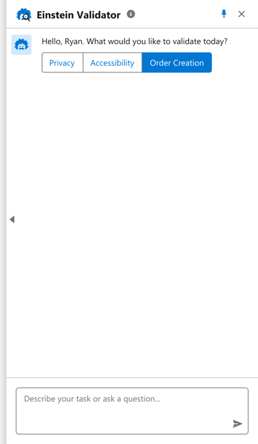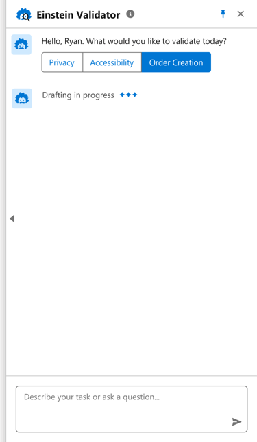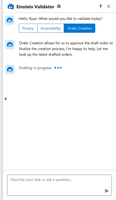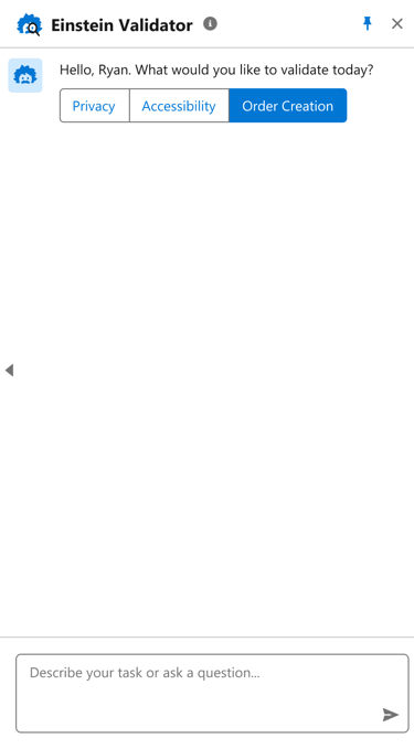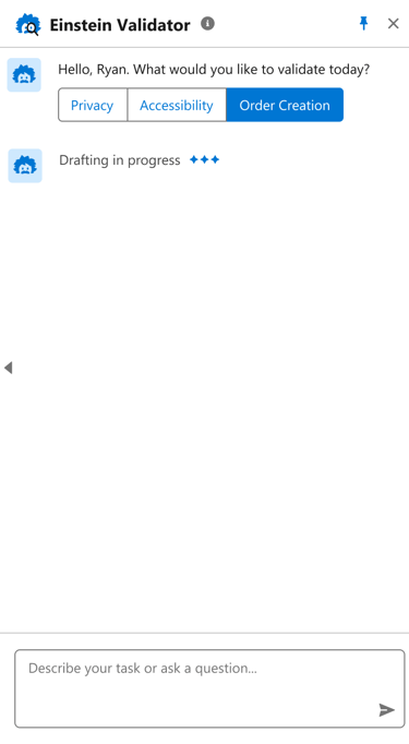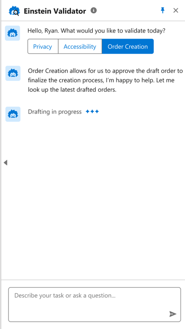 Our team proposed an idea, 'Einstein Validator' - an AI assistant to provide comprehensive support through simple chat interactions, offering limitless possibilities for enhancing Privacy, Accessibility, Product promotion, Deal Generation, Order Creation, Reviews, and more.