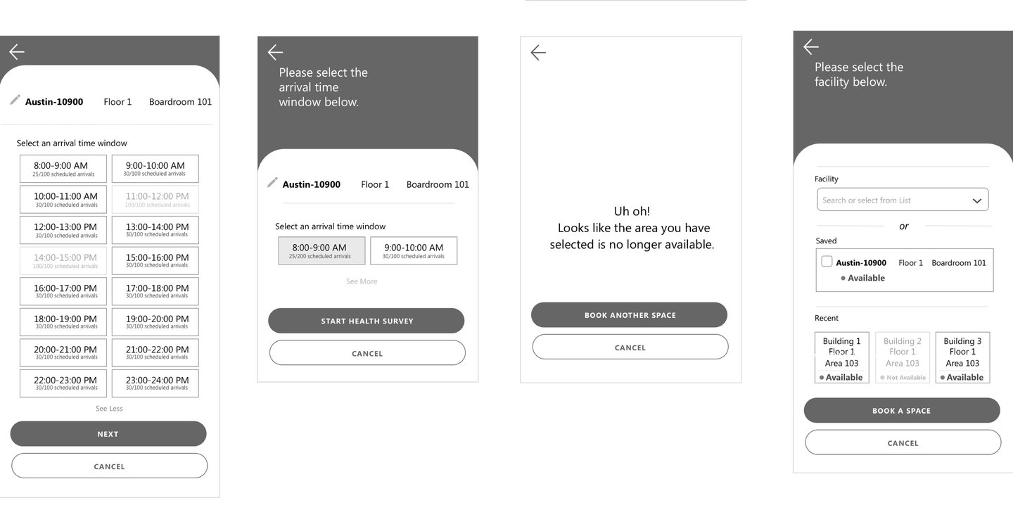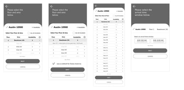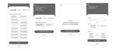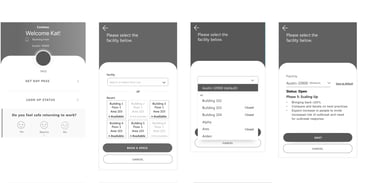 After conducting our research, we decided to focus on users' pain points for their daily passes to the office. This solution included various features such as selecting and assigning their facility, booking workspace, and obtaining a daily pass. We went through multiple iterations to create high-level and hi-fi wireframes to help ease the overall process. A set of wireframes illustrates one flow, specifically the whole process of obtaining a daily pass.